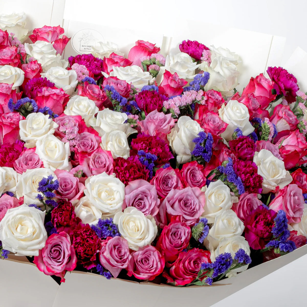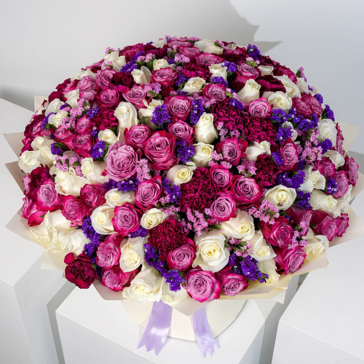 The Ivy Grand bouquet showcases purple and white roses, lush purple carnations, and delicate pink and purple statice. Wrapped in our elegant Grand wrap, this arrangement brings timeless beauty to any occasion.