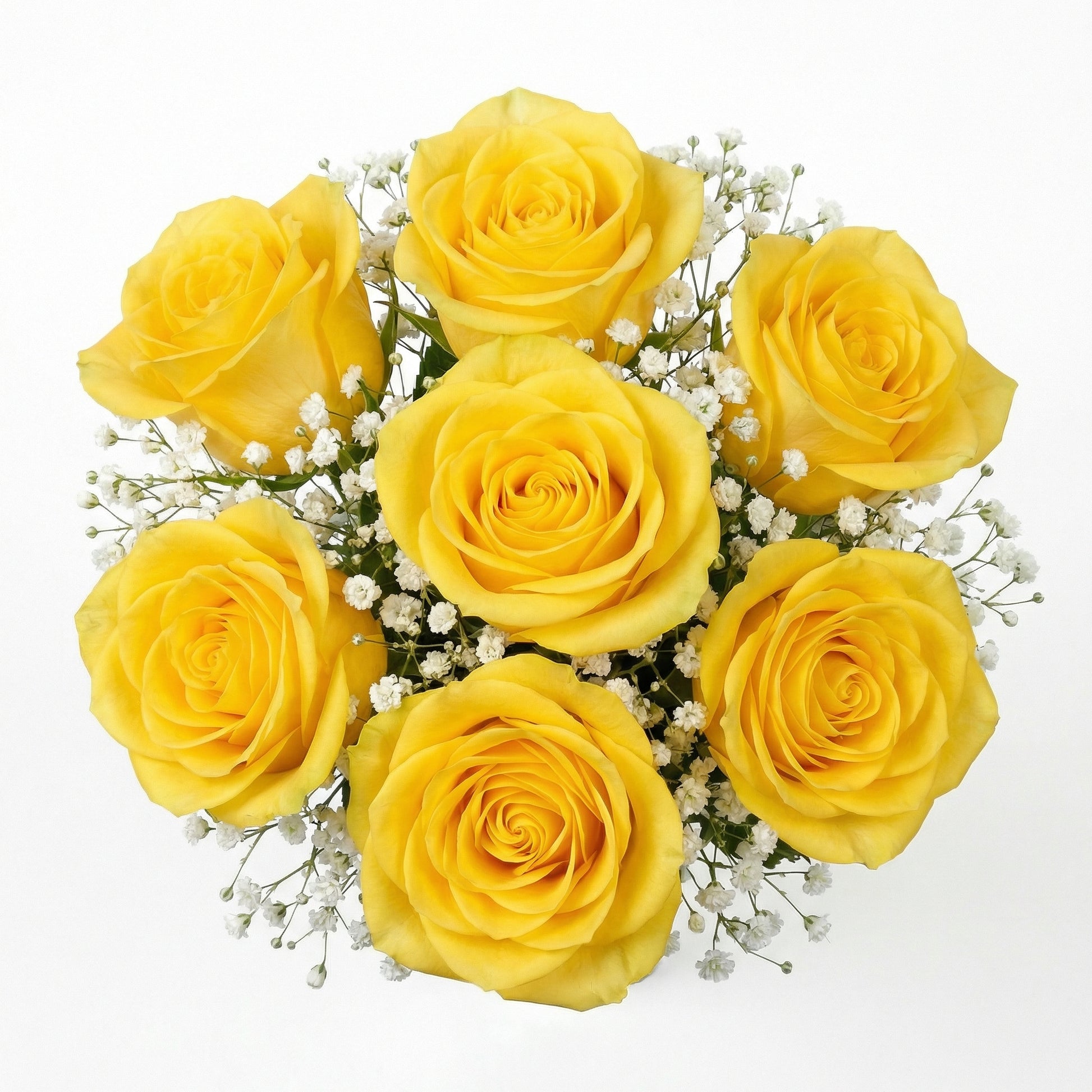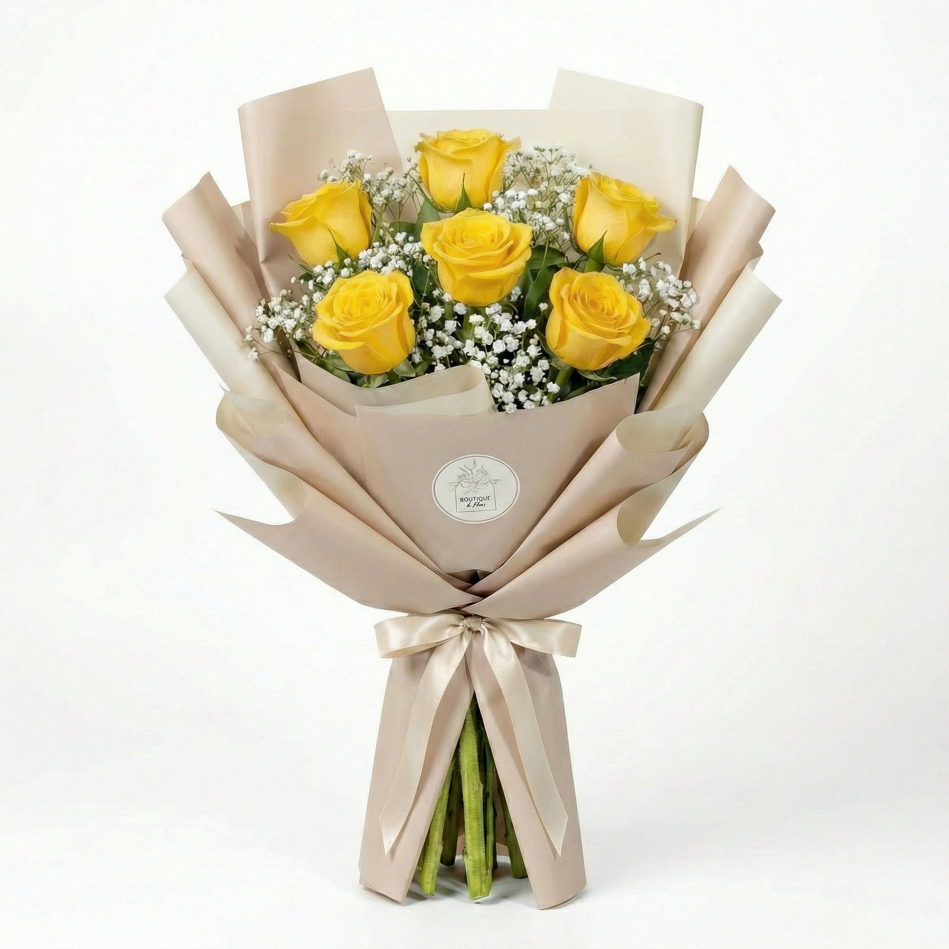 Featuring 6 vibrant yellow roses paired with delicate white baby’s breath, this hand-tied arrangement combines sunny, uplifting tones with soft, airy accents. Wrapped in Boutique de Fleurs’ signature luxury matte paper and finished with a satin ribbon, it’s a perfect blend of elegance and happiness.